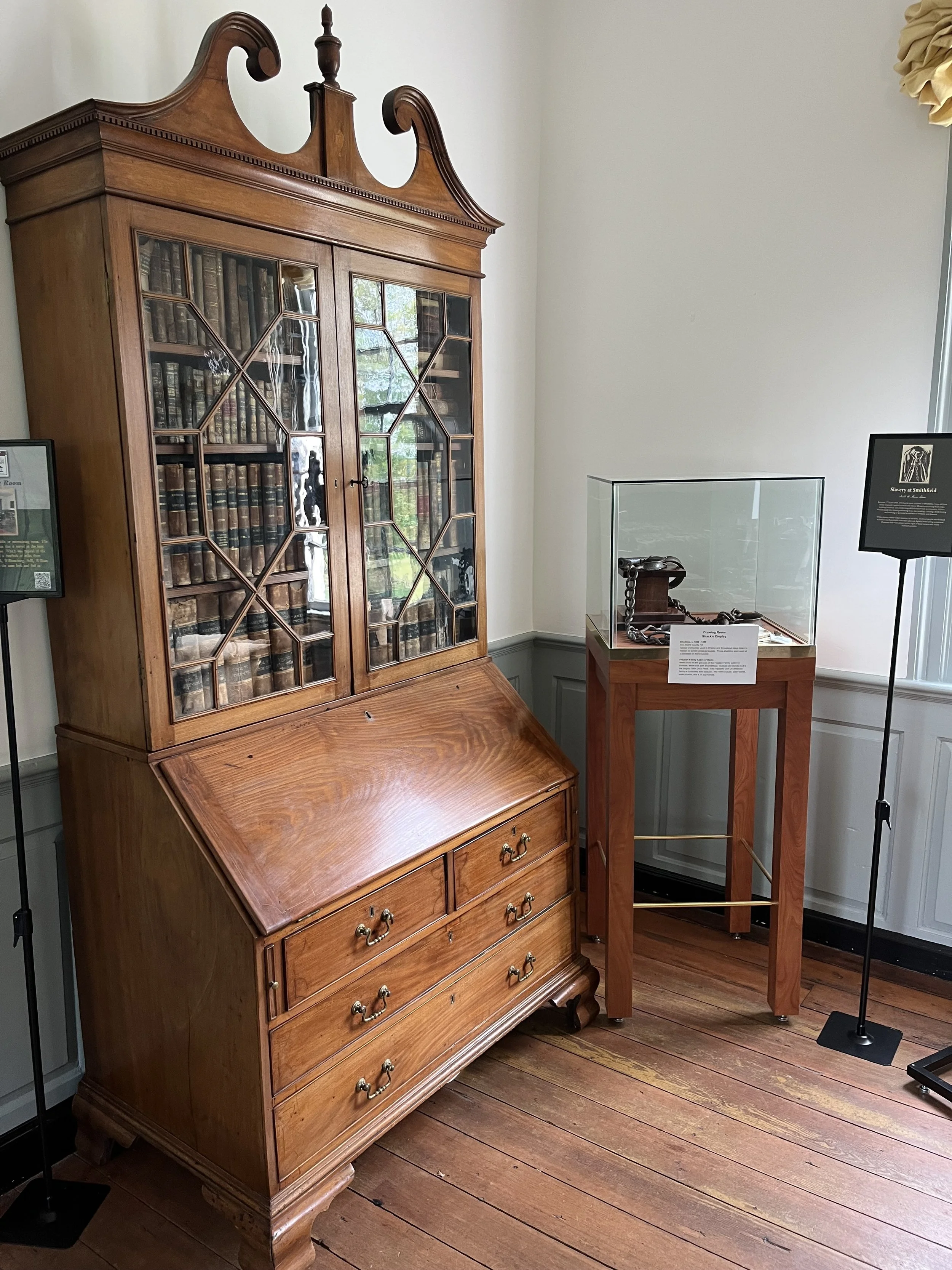 The fireplace surround was copied directly from Raleigh Tavern in Williamsburg. After the original Raleigh Tavern burned in 1859, reconstruction architects visited Smithfield to copy the fireplace surround design to place back in the reconstructed tavern. This room was used as a place of gathering for the Preston family, a place to entertain guests and conduct business conversations. It was also used as the primary place where conversations about divisions of property were held. At the time of deaths or marriages primarily, the Preston family would gather in this room to discuss wills and the division of land and property, which at the time included the enslaved individuals at Smithfield. While this room was a merry gathering place for the Preston family, it was a place of division and ripping apart for the enslaved community of Smithfield. Enslaved individuals had no control over what would happen to them or their family members when these divisions occurred.
