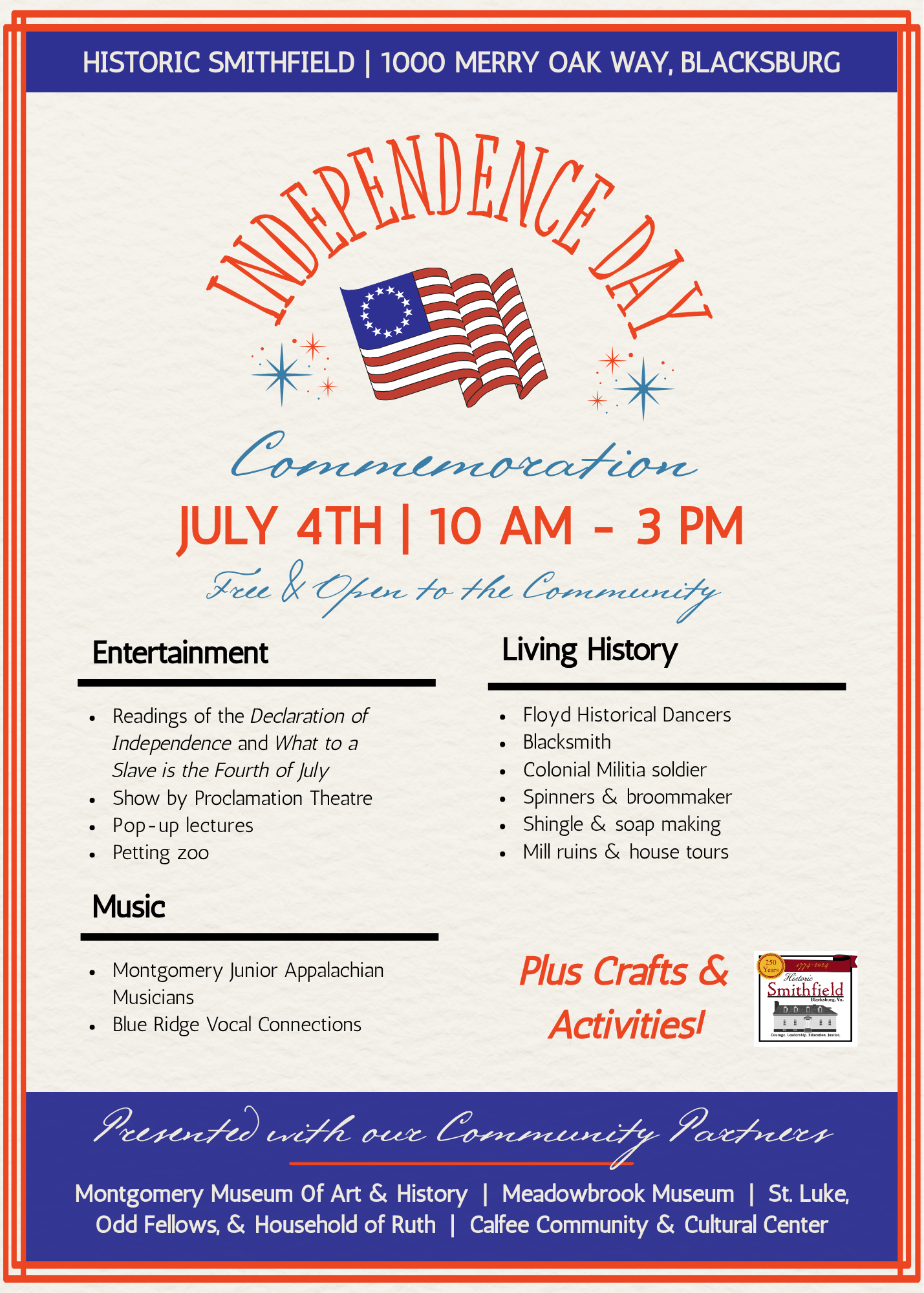 The day's programming takes seriously both the promise and the complexity of July 4th. Hear the Declaration of Independence read aloud alongside Frederick Douglass' landmark 1852 address, What to the Slave is the Fourth of July?, presented by Blacksburg Town Councilman Darryl Campbell. The Proclamation Theatre and Floyd Historical Dancers will perform, and the Montgomery Junior Appalachian Musicians and Blue Ridge Vocal Connections will provide live music throughout the day.
